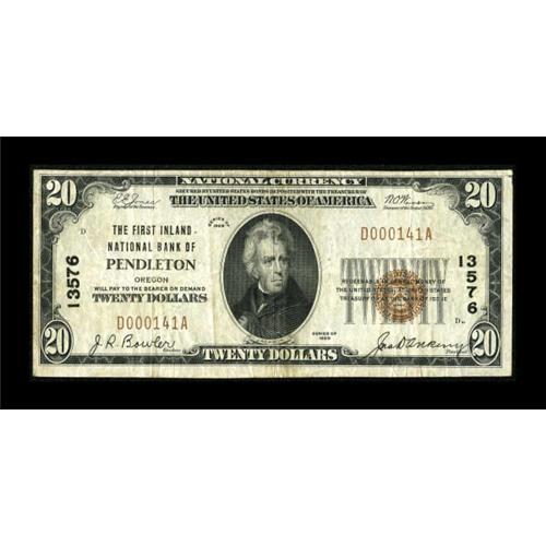 <B>Pendleton, OR</B></I> - $20 1929 Ty. 1 <B>The First Inland NB</B></I> Ch. # 13576<BR> This was the last of Pendleton's six issuers, only two of which issued Series 1929 notes. While not rare, offerings from here have been few and far between in recent years, with Track and Price showing just two since 1990. <B>Very Fine.</B></I><BR><BR><b>Shipping:</b> Coins & Currency (<a target="_blank" href="http://www.heritageauctions.com/common/shipping.php">view shipping information</a>)