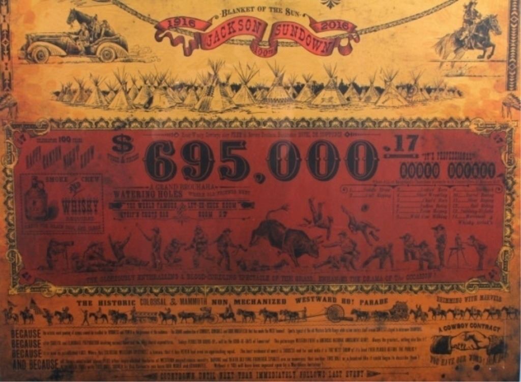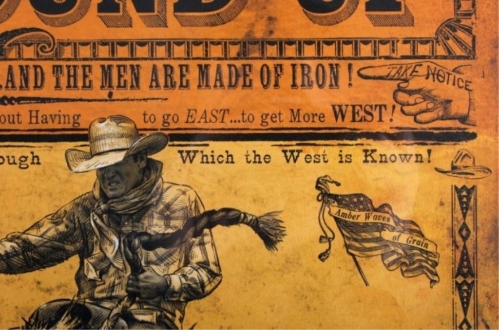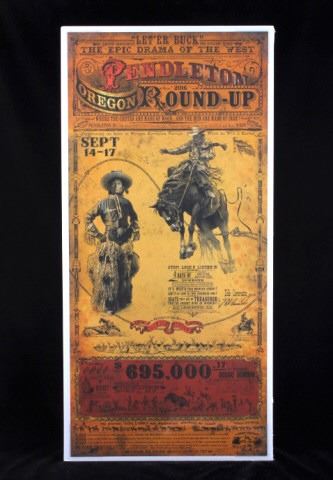 Featured in this lot is this is an original Pendleton Round-Up poster by renowned Western artist Bob Coronato. The poster was made in a 19th century style with fantastic graphics including a bronc rider and a cowboy dressed in wooly chaps. The poster has been hand signed by the artist. The condition of this poster is well preserved with no obvious signs of damage and shows no creases and fine lining and coloration. The measurements of this poster is 18 1/2" x 39 1/4". Posters will ship without backing.