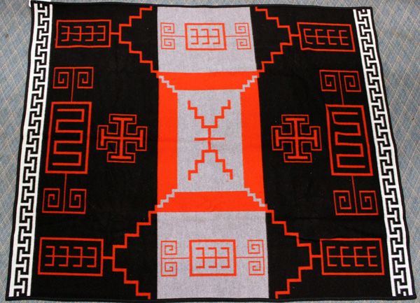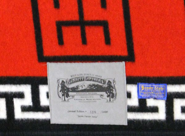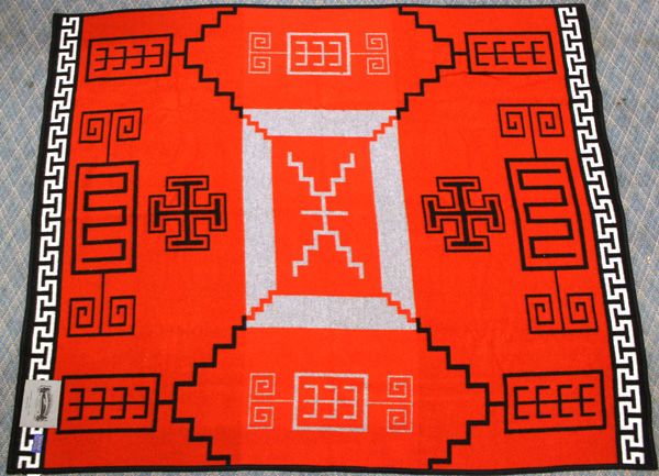 Pendleton Wool Robe in a Storm pattern. Wonderful Color in red, black, and white. Measures 76''L x 66''W. Sewn in Blue Pendleton label and is a Babbitt Brothers 100th Anniversary Limited edition marked 114/2000.