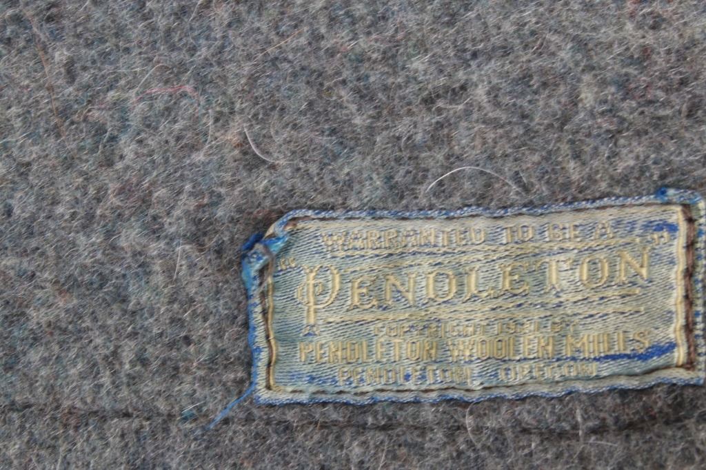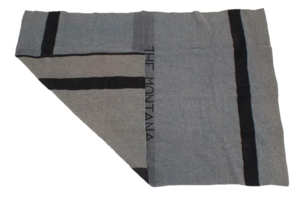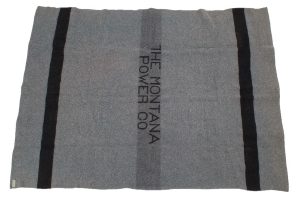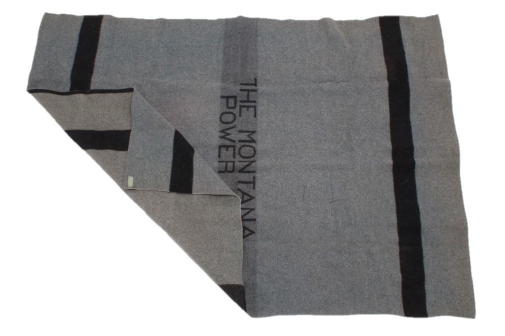In this lot is a "The Montana Power Co." wool blanket made by Pendleton Mills, OR. The blanket is grey with a black end border, a black stripe on top and bottom, and a reverse panel in the center. One side of the reverse panel is black with “The Montana Power Co.” in grey on the black band. On the other side is “The Montana Power Co.” in black. The blanket is in good overall condition. The blanket measures approximately 60" X 81".