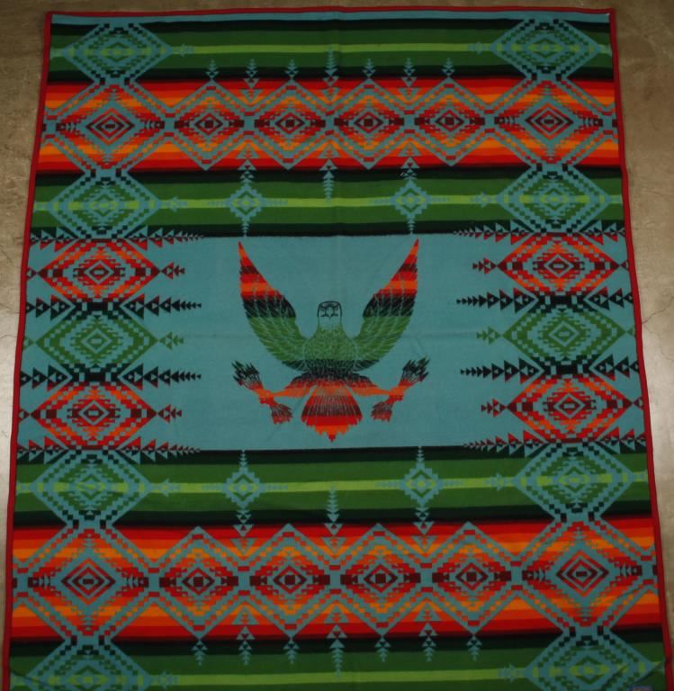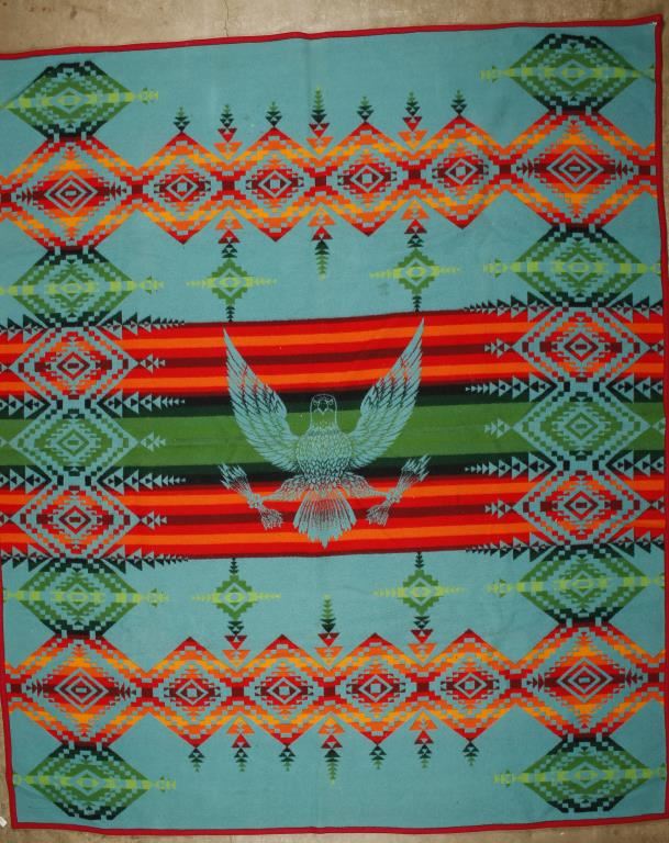 Beaver State wool reversible blanket with Native American patterns and an eagle with arrows in the center. Measures 60" x 40" with vibrant colors and only minor losses and two holes punched in corners. Great Southwestern decorator.