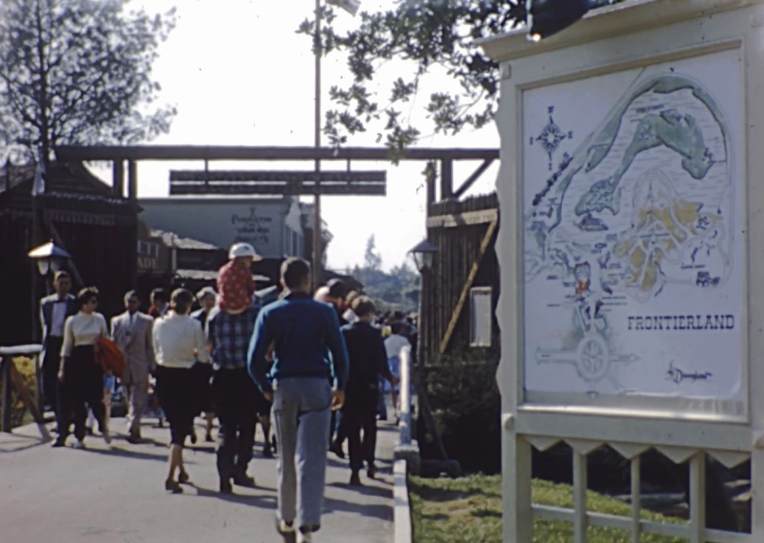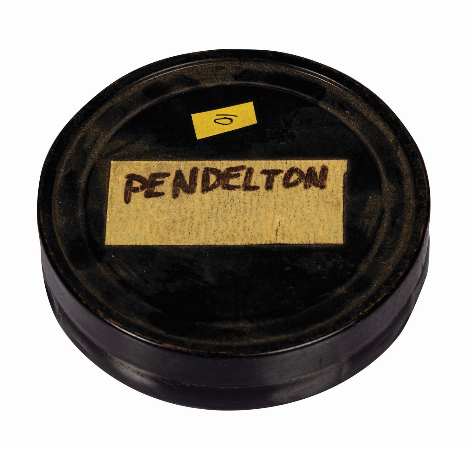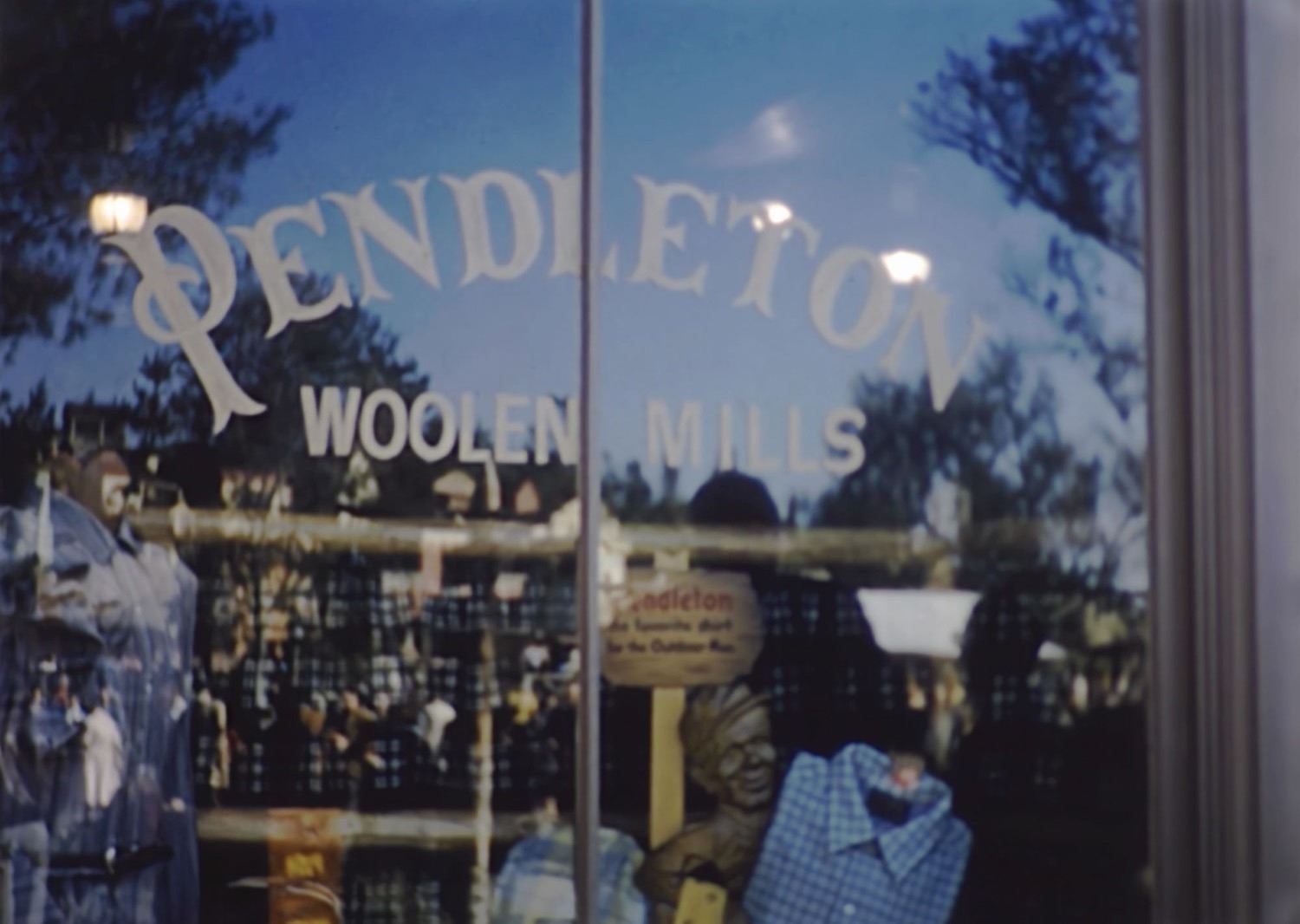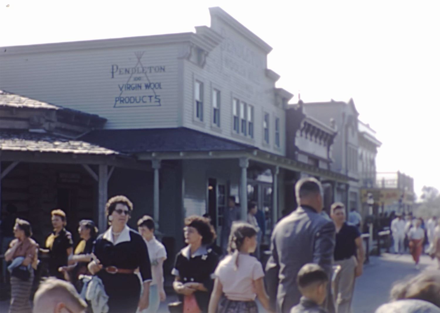 (Disneyland, c.1957) An extremely rare 16mm film featuring Pendleton Woolen Mills Dry Goods Emporium in Frontierland. A Frontierland landmark for nearly 35 years, the Pendleton store was the largest sponsored shop at the park when it opened in 1955. The film comes from the collection of Disney Legend Milt Albright, and contains 1 minute and 24 seconds of rare silent color footage of the store's exterior and window display. This incredible and scarcely seen footage from the park's earliest years comes in a 3.75" in diameter metal canister, as stored by Albright. The film has been tested and is in very good condition with minor wear from use.