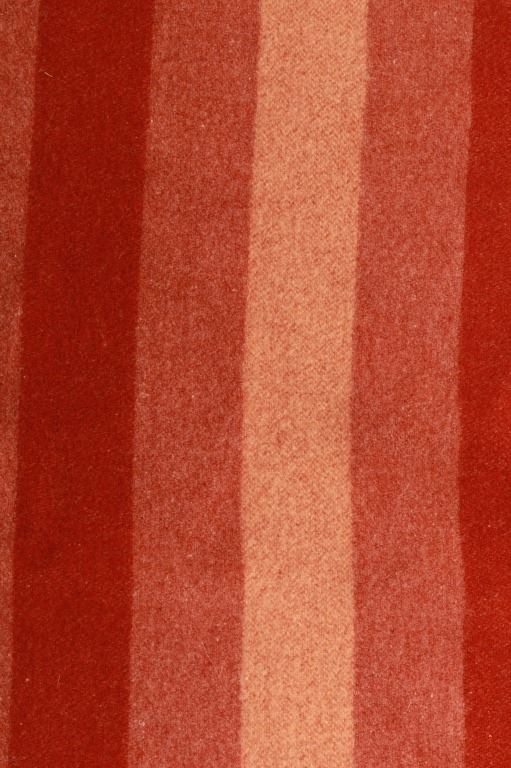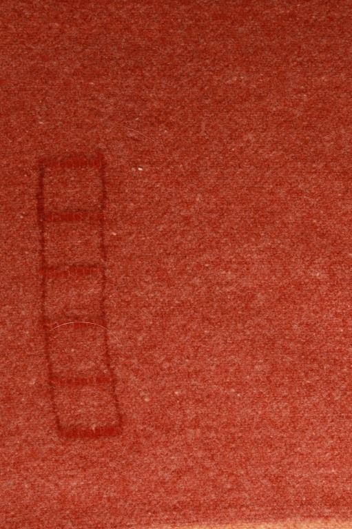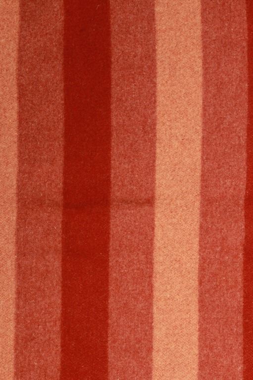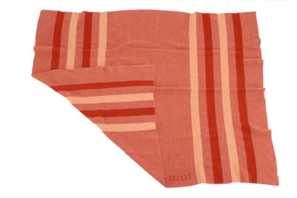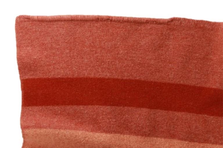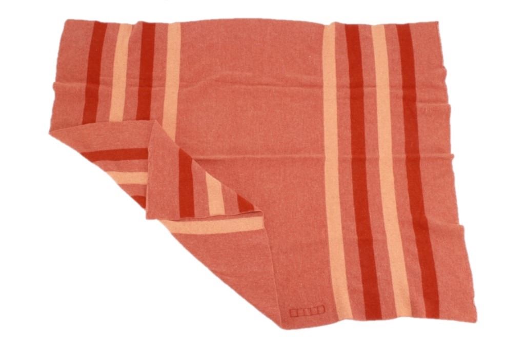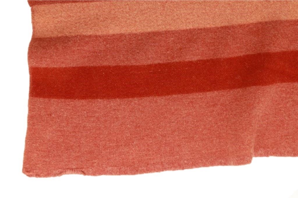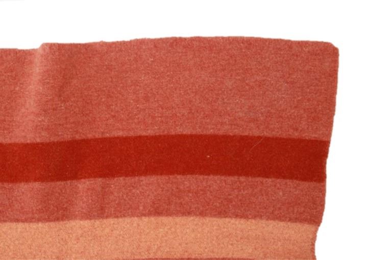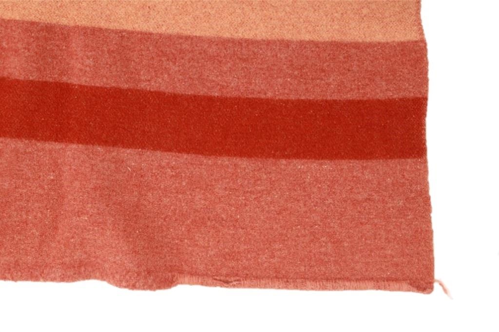 Featured in this lot is this wool blanket attributed to Pendleton Woolen Mills wool blanket, circa 1960's. The blanket features a clay red with light reddish cream bands and a darker red band that are symmetrical on both sides. The tag has been removed, so this blanket is attributed to Pendleton Woolen Mills style of trade blanket. The condition of this trade blanket is good, with the trade tag missing. The measurements of this trade blanket are 67" x 58".
