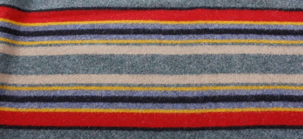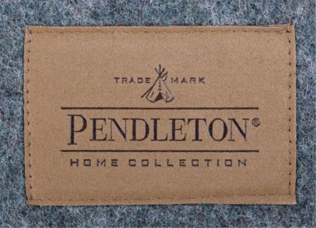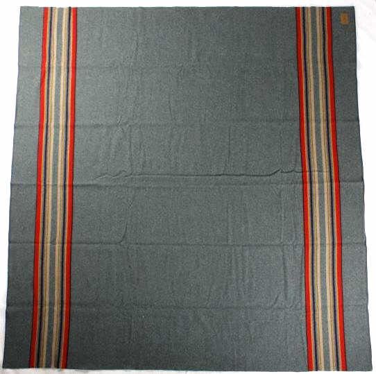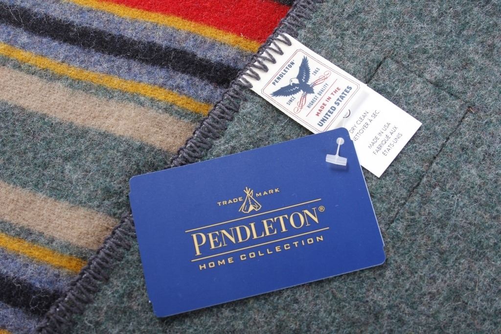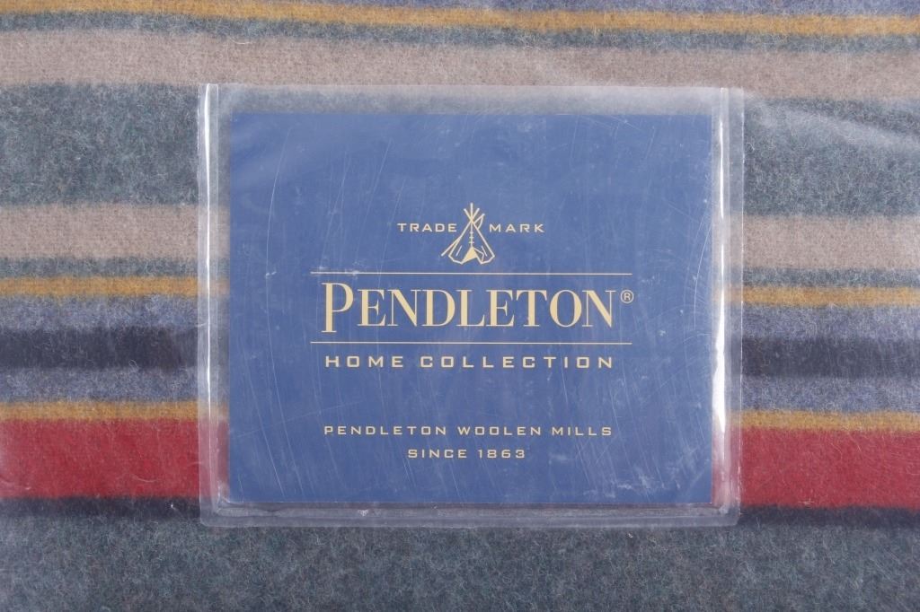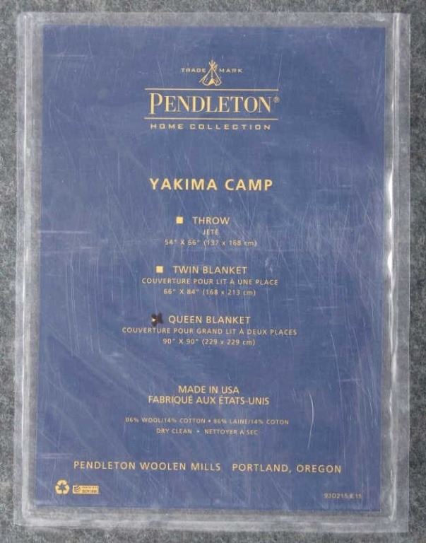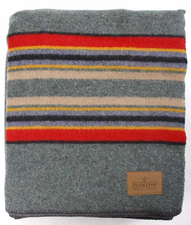 This is a Pendleton Yakima Camp wool blanket. The blanket is made from wool-blend and shows a wonderful dark green color with multi colored stripes. The leather tag in the corner is marked "Pendleton Home Collection". The Yakima Camp blanket is in new, excellent condition. It measures 66" x 84".