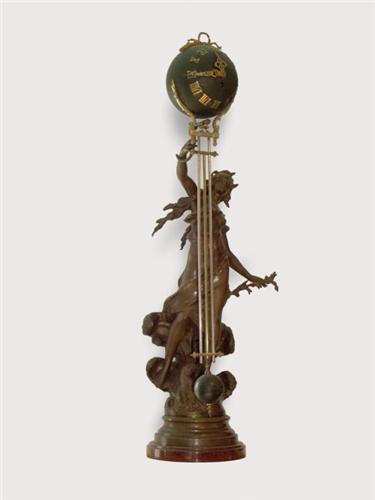 Pendule mystérieuse oscillante par Auguste Moreau vers 1900. Mouvement logé dans la boule, échappement à ancre, hauteur: 96 cm