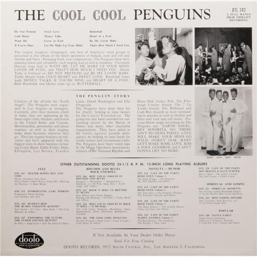 <B>Penguins "The Cool Cool Penguins" Mono LP Blue and Yellow Label Dooto DTL 242 (1959).</B></I> The Penguins were one of the first great R&B vocal groups to cross over to the Pop charts in 1954 with the classic "Earth Angel". It was 1959 before the group released their one and only album -- although they did appear on various compilation albums. The blue and yellow label version is one of two issued originally, and is much rarer than the black label variation that came later. This is just a jaw-dropping, virtually perfect copy -- both cover and disc -- of a record that's a difficult find in any condition. Condition: GM-MT 10 / GM-MT 10. <I>From the GRT Collection</B></I>