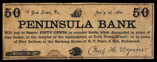 York Town, VA, 1862, 50 cents, Issued, small sailboat on top and small dog on bottom middle, payable at York Town Wharf or at H.T. Pairo & son, Richmond, the note would have graded a nice Good to VG but has been rebacked, a vertical split in the middle repaired and a small piece of the left edge repaired, attractive note rarely seen in any condition. S/N 138, There are 3 Hebrew Letters on the bottom margin to the left of the small dog, evidently by the printer.