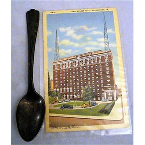 </font></strong>This is a nice set for collectors of Pennsylvania memorabilia. The Penn Albert Hotel opened in 1922 in Greensburg, PA and we have a silver plated spoon by the Meriden Silver Plate Company from the hotel restaurant. Then we have a postcard that was probably sold at the hotel in the 30s, signed, and in great condition. Spoon has been left unlcleaned. A great find for those interested in Pennsylvania history.</font>