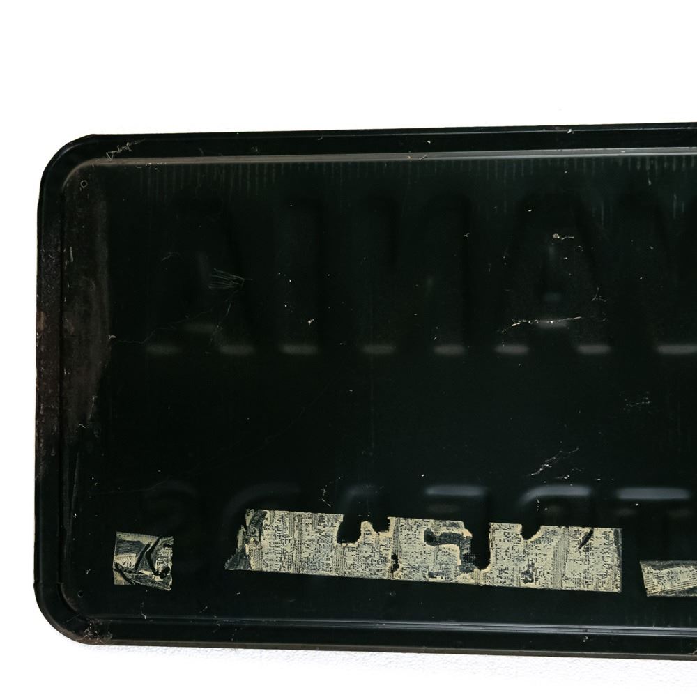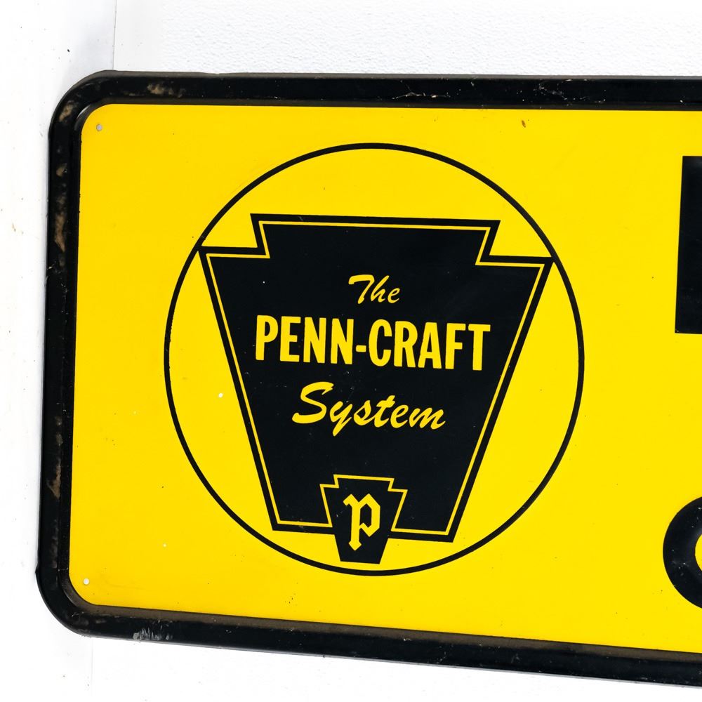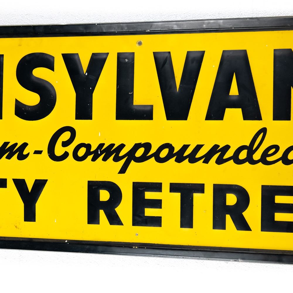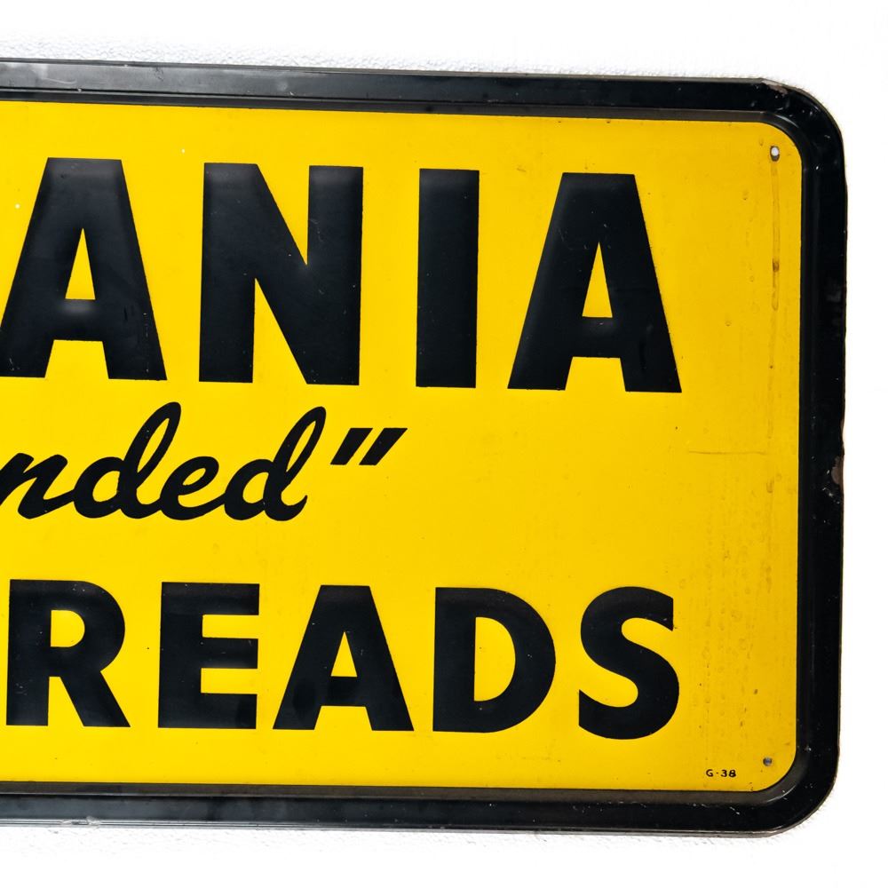 Vintage "Pennsylvania Quality Retreads" embossed single sided tin advertising sign. "G-38" stamped near bottom corner; good to good overall condition with some discoloration, dings, stray marks (paint drips) and oxidation. Approximately 17"t x 72"l. Please use photos to judge condition and bid accordingly.