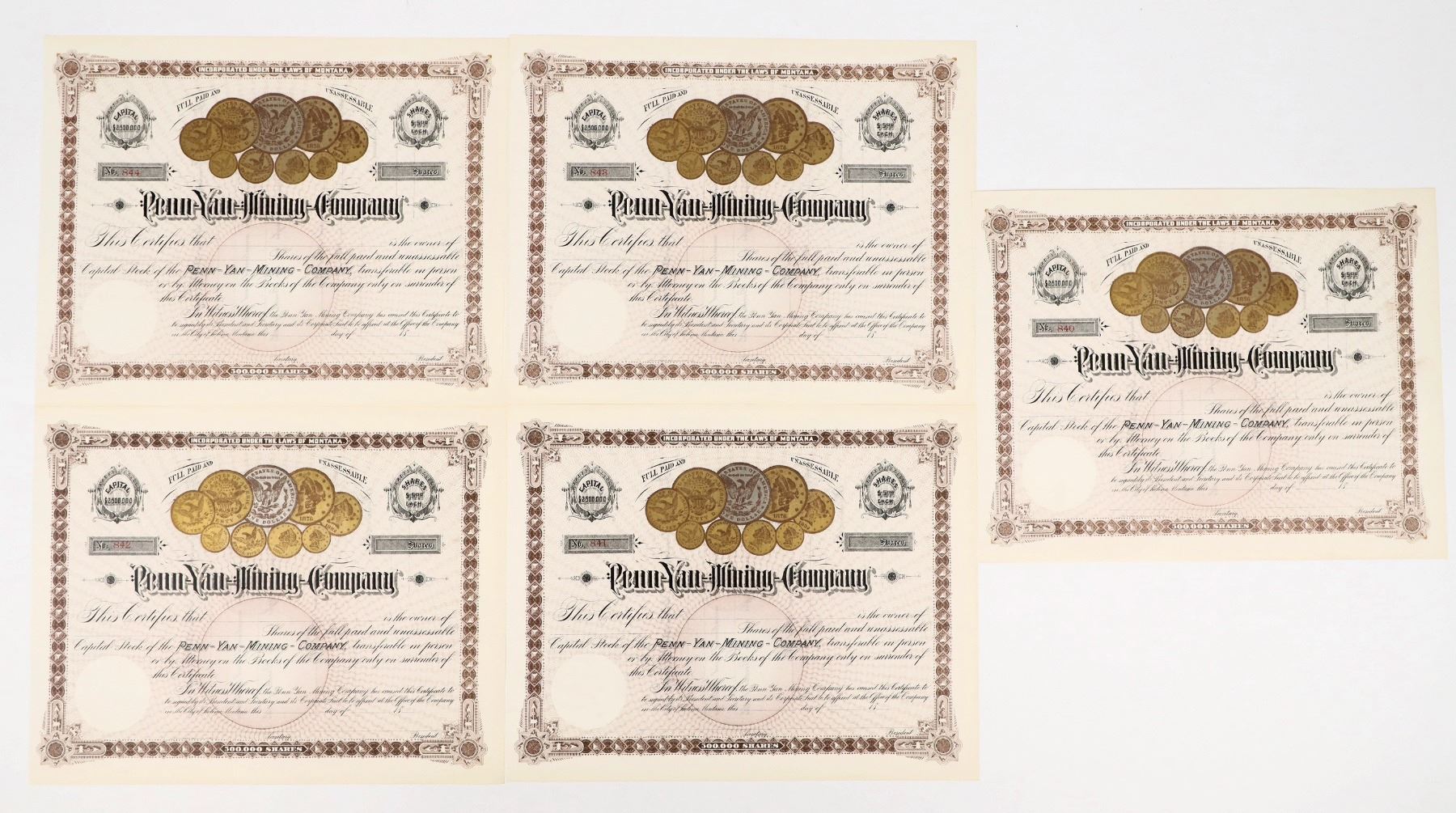 Lot of 5 unissued. Excellent condition. Five coins shown in vignette (obverses and reverses): 1873 2 1/2c, 1880 five c, 1882 ten cent, 1876 twenty cent and reverse of silver dollar. The company had its headquarters in Helena with the mine located in Wickes (now a ghost town). Produced $50,000,000 in gold and silver before operations ceased in the early 1890's. Records show the business ran from 1888 to 1892.