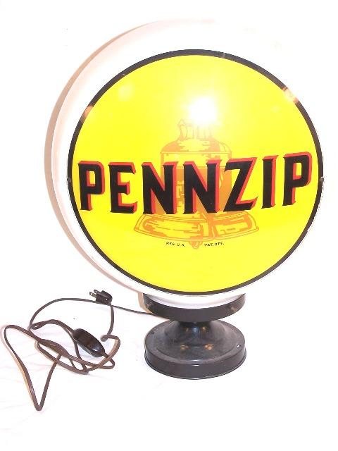 Penn Zip Advertising lighted globe, milk glass white with yellow center on front side only as shown in photos. Approx 37" x 20". Condition is good and working. Small chip near inside fitter as shown in photo!