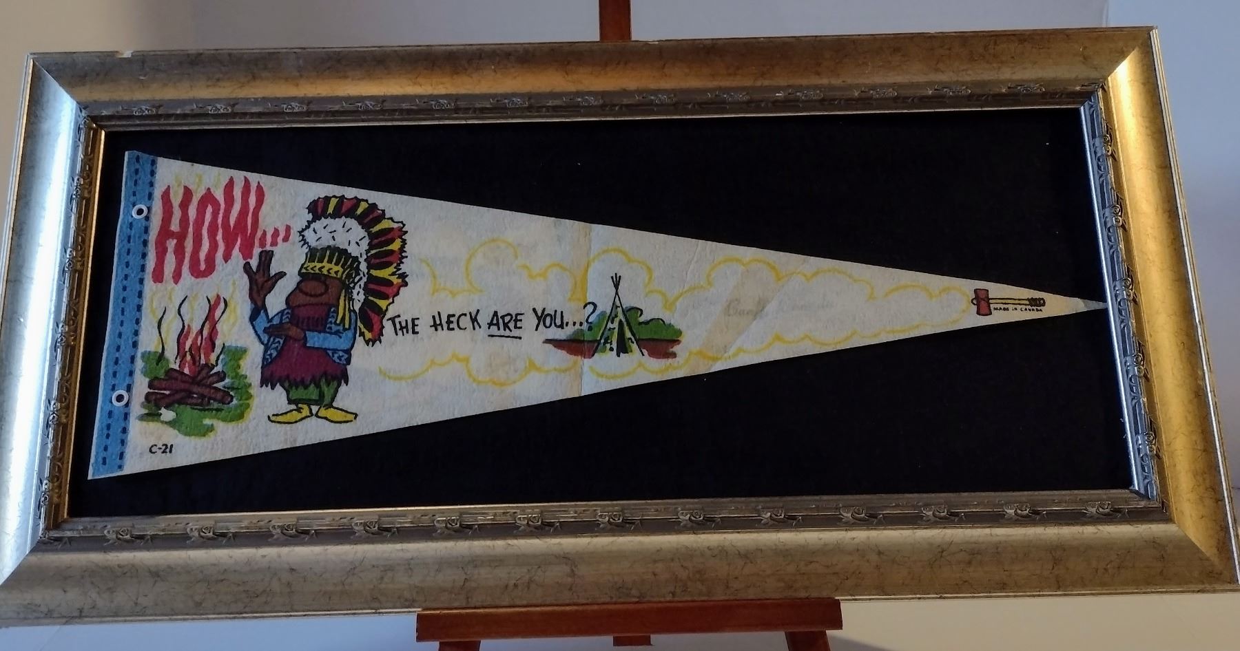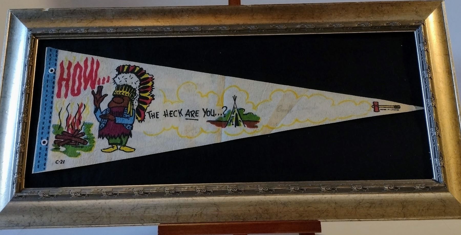 Pennant which reads “How the heck are you,” cartoon of First Nation man, sold in Banff, Canada, 1970,s. (Framed)
