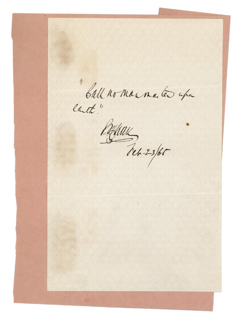 SALMON P. CHASE (1808-1873) American politician and jurist. Chase served as Senator from Ohio, governor of that state, U.S. Treasury Secretary and a Chief Justice of the United States. Chase was a staunch opponent of slavery, a stanch powerfully illustrated by this quotation. Autograph Quotation Signed, “S.P. Chase.” One page, 5 1/8” x 8”. No place. February 23, 1865. . Chase writes, “Call no man master upon Earth.” It should be noted that on the very day Chief Justice Chase penned this quotation, Minnesota became the seventeenth state to ratify the 13th Amendment. Mounted to a larger leaf. Some discoloration from glue at left edge. Overall Very Fine.
