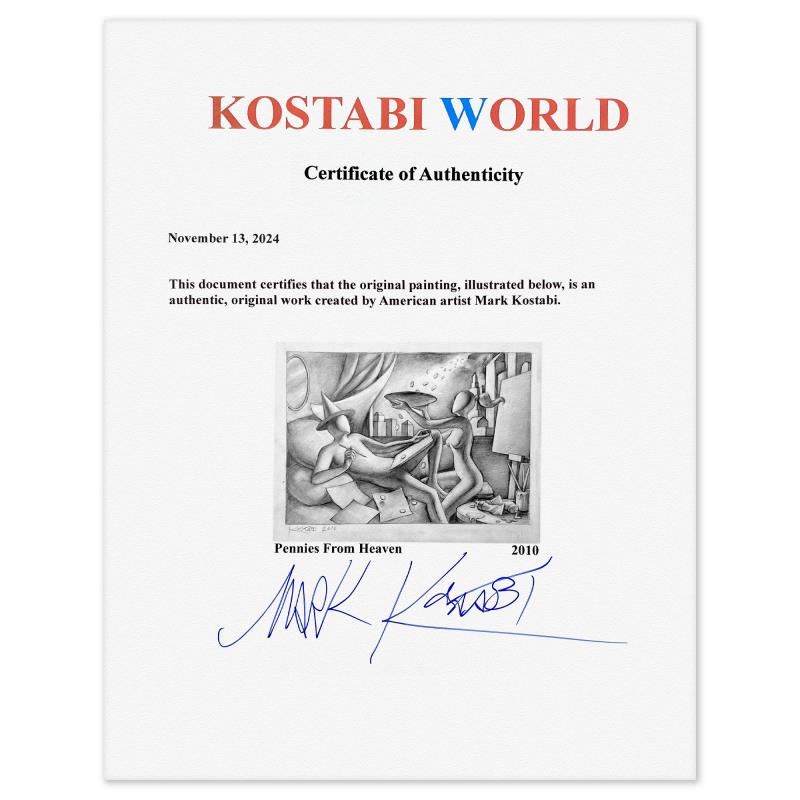 "Pennies from Heaven" is an original drawing on paper by Mark Kostabi, hand signed by the artist. This piece comes custom framed. Includes Certificate of Authenticity. Measures approx. 16" x 19.5" (frame), 10" x 13.5" (image). This item requires special handling and may have a longer than usual turnaround.