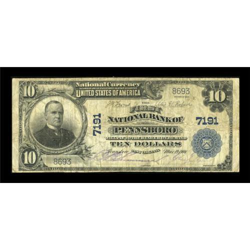 <B>Pennsboro, WV</B></I> - $10 1902 Plain Back Fr. 624 <B>The First NB</B></I> Ch. # 7191<BR> A nicely margined piece from the first of Pennsboro's two issuing banks to receive its charter, both being granted within the space of a few months in 1904. Both failed to survive the Depression. The Kelly census documents only seven large size from here. This <B>Fine</B></I> example displays legible signatures.<BR><I>From The Kansas City Collection.</B></I><BR><BR><b>Shipping:</b> Coins & Currency (<a target="_blank" href="http://www.heritageauctions.com/common/shipping.php">view shipping information</a>)