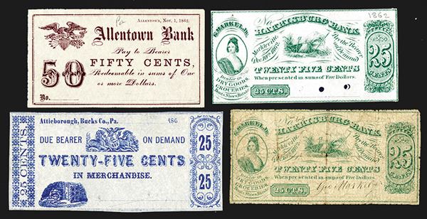 Lot of 4 notes, Includes Harrisburg Bank, G. Markel Jr., 1862, 25cts, one issued and one remainder; Allentown Bank, 50cts, remainder, Unc.; and Attleborough, Bucks Co., PA, 186x, 25cts, remainder, Unc.