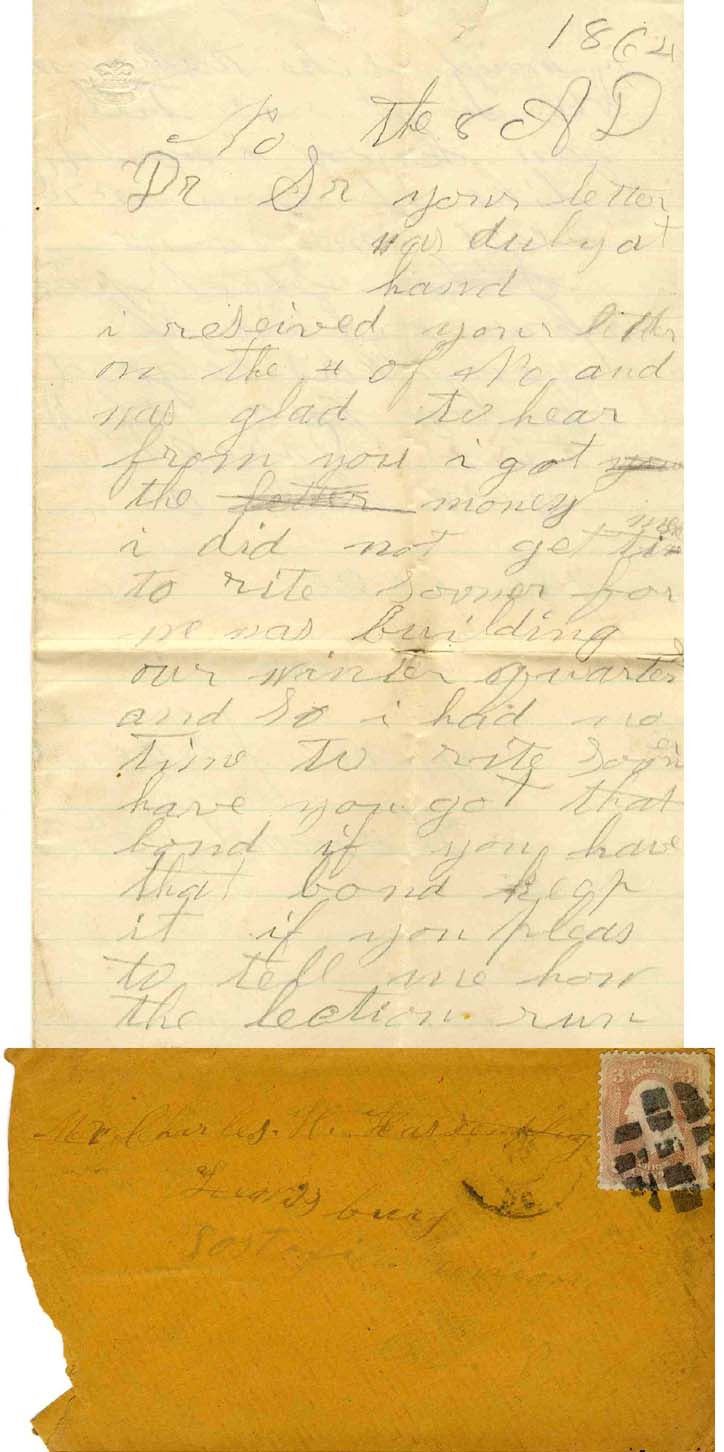 ALS from Howard Renner of the 56th Pennsylvania Infantry, Company F. Accompanied by cover. Written in pencil and dated 8 November 1864, letter reads in part: ''...i reseived your letter...and was glad to hear from you i got the money i did not get time to rite Sooner for we was building our winter quarters and So i had no time...have you got that bond if you have that bond keep it...'' Renner mustered into Company F as a substitute on 1 October 1864. He was discharged eight months later on 31 May 1865. The 56th Pennsylvania Infantry was involved in some of the war's bloodiest battles, including Second Bull Run, Antietam and Gettysburg. During its three years of service, 215 men from the regiment died, 118 of whom were killed in action. Pencil letter measures 5'' x 8.25'' and runs 2pp. Small tears and separation at creases. Excellent condition.