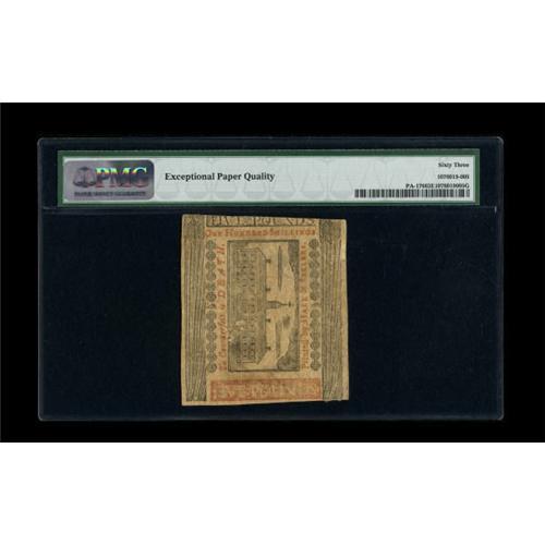<B>Pennsylvania April 10, 1775 £5 PMG Choice Uncirculated 63 EPQ.</B></I><BR> This is the scarcest of the 1770s Pennsylvania types and the higher of the only two denominations in the 1775 issue. The Philadelphia City jail known as the Walnut Street Workhouse appears on the back in a nicely engraved vignette. In fact this issue was authorized to raise money for the construction of jails. This example has two dark signatures in black ink, while the red signature, as is almost always the case, has faded. <BR><BR><b>Shipping:</b> Coins & Currency (<a target="_blank" href="http://www.heritageauctions.com/common/shipping.php">view shipping information</a>)