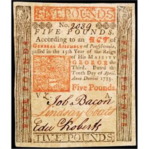 Pennsylvania, April 10, 1775, £5, Plate A, Philadelphia "Work House" vignette.