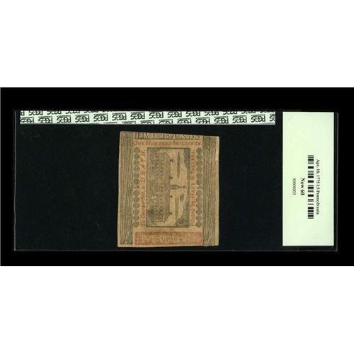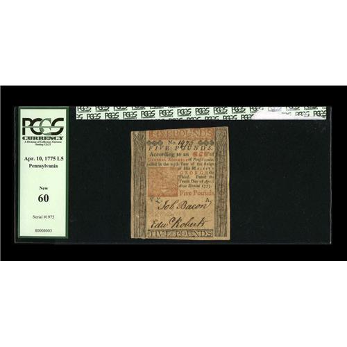 Pennsylvania April 10, 1775 L5 PCGS New 60. This is the Pennsylvania April 10, 1775 L5 PCGS New 60.
