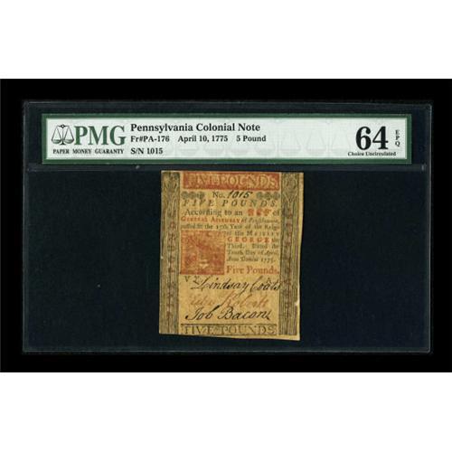 <B>Pennsylvania April 10, 1775 L5 PMG Choice Uncirculated 64 EPQ.</B></I> A pleasing "Workhouse" issue with bold remaining signatures and a rich red inked details. The paper is perfectly original with solid embossing.<BR><BR><b>Shipping:</b> Coins & Currency (<a target="_blank" href="http://www.heritageauctions.com/common/shipping.php">view shipping information</a>)