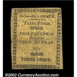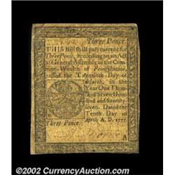 Pennsylvania April 10, 1777 3d Very Fine. A problem-free example. Important notice: We expect to be auctioning lots at the rate of 200-250 per hour. Sometimes eBay Premier live bid software cannot keep up with that pace, so we strongly recommend that you place a realistic proxy bid now as insurance to avoid disappointment. Also please note that all Heritage/CAA lots purchased through eBay Premier carry a 20% Buyer's Premium. Please make sure you read the Terms and Conditions.