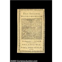 Pennsylvania April 10, 1777 4s Very Choice New. Lots of grade for this issue, which is quite common up through About New, but rather rare above that. The face is fully margined, and the back just barely touches at one edge.  Important notice: Heritage usually auctions material at the rate of 200-250 lots per hour. On some occasions eBay Live bid software or the Internet may not be able to keep up with the pace of the auction. We recommend placing a realistic absentee bid now as insurance to avoid disappointment. Occasionally the auctioneer may eliminate or reject an eBay Live bid, and the auctioneer may also reopen a lot after the close of the eBay live bidding (usually because we missed an audience bid), and may reject your bid even if it shows you as the winning bidder. By bidding via eBay Live, you agree that Heritage may award the lot to another bidder at its sole discretion under the circumstances described above or any other reasonable circumstances. Also please note that all Heritage lots purchased through eBay Live carry a 20% Buyer's Premium. Please make sure you read the Terms and Conditions before you bid.