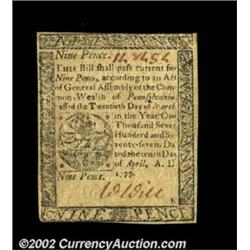 Pennsylvania April 10, 1777 9d About New. A pretty example, with decent margins and a good signature