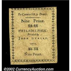 Pennsylvania April 10, 1777 9d About New. A pretty example, with decent margins and a good signature. Important notice: We expect to be auctioning lots at the rate of 200-250 per hour. Sometimes eBay Premier live bid software cannot keep up with that pace, so we strongly recommend that you place a realistic proxy bid now as insurance to avoid disappointment. Also please note that all Heritage/CAA lots purchased through eBay Premier carry a 20% Buyer's Premium. Please make sure you read the Terms and Conditions.
