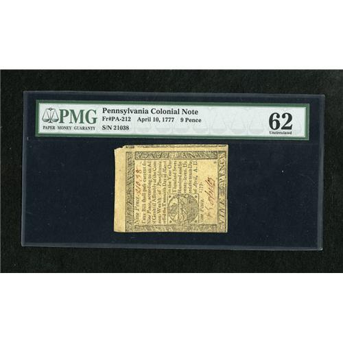<B>Pennsylvania April 10, 1777 9d PMG Uncirculated 62.</B></I> A well signed and well embossed small change note that would easily garner the choice grade if the centering were better.<BR><BR><b>Shipping:</b> Coins & Currency (<a target="_blank" href="http://www.heritageauctions.com/common/shipping.php">view shipping information</a>)