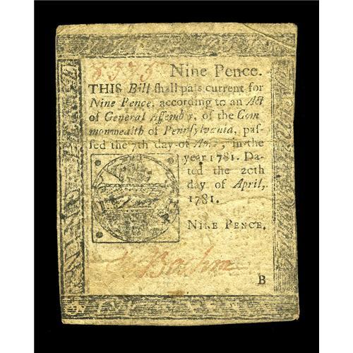<B>Pennsylvania April 20, 1781 9d Fine-Very Fine.</B></I> A well margined, good-looking example of this late-issued Pennsylvania Small Change note.
