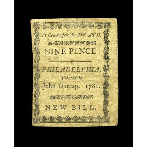 <B>Pennsylvania April 20, 1781 9d Fine-Very Fine.</B></I> A well margined, good-looking example of this late-issued Pennsylvania Small Change note.<BR><BR><b>Shipping:</b> Coins & Currency (<a target="_blank" href="http://www.heritageauctions.com/common/shipping.php">view shipping information</a>)