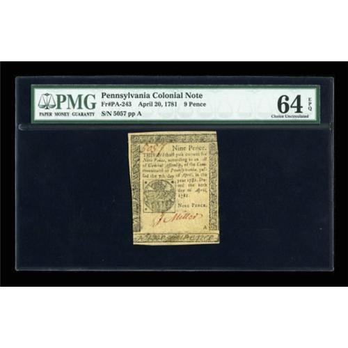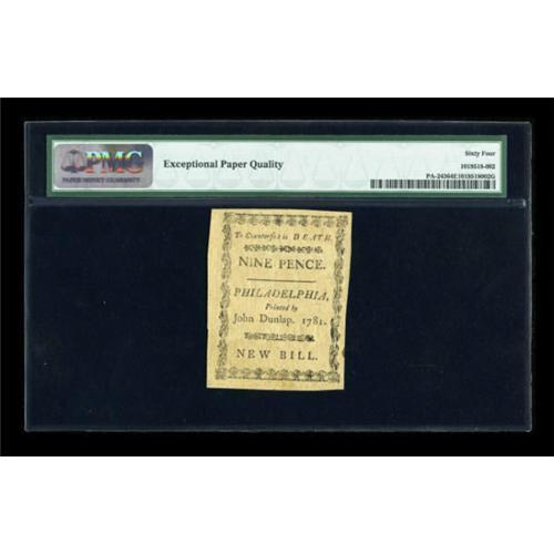 <B>Pennsylvania April 20, 1781 9d PMG Choice Uncirculated 64 EPQ.</B></I> The signature of J. Miller remains strong on this perfectly original issue. Previously, the finest example of this issue we have handled was only Choice Uncirculated.<BR><BR><b>Shipping:</b> Coins & Currency (<a target="_blank" href="http://www.heritageauctions.com/common/shipping.php">view shipping information</a>)