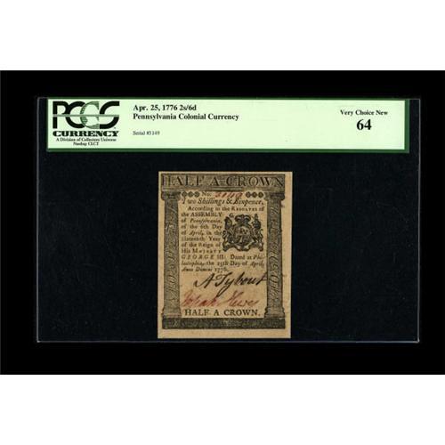 <B>Pennsylvania April 25, 1776 2s/6d PCGS Very Choice New 64.</B></I> Bold signatures and excellent print quality set this note apart. <BR><BR><b>Shipping:</b> Coins & Currency (<a target="_blank" href="http://www.heritageauctions.com/common/shipping.php">view shipping information</a>)