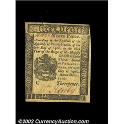 Pennsylvania April 25, 1776 3d Choice About New. A very nice example of a Pennsylvania Small Change note. Important notice: We expect to be auctioning lots at the rate of 200-250 per hour. Sometimes eBay Premier live bid software cannot keep up with that pace, so we strongly recommend that you place a realistic proxy bid now as insurance to avoid disappointment. Also please note that all Heritage/CAA lots purchased through eBay Premier carry a 20% Buyer's Premium. Please make sure you read the Terms and Conditions.