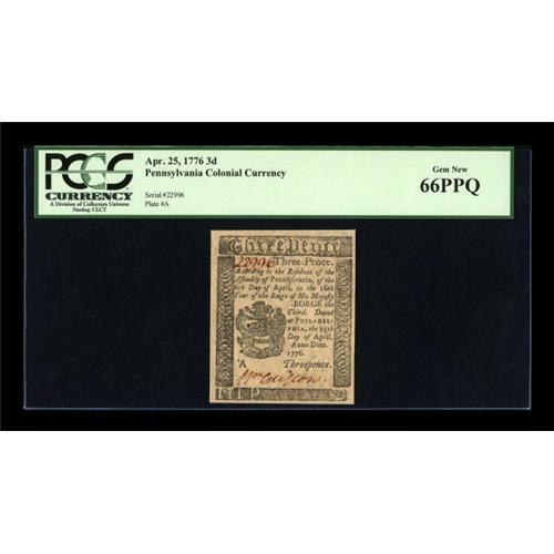<B>Pennsylvania April 25, 1776 3d PCGS Gem New 66PPQ.</B></I> This note, and the next two following, are consecutively numbered.<BR><BR><b>Shipping:</b> Coins & Currency (<a target="_blank" href="http://www.heritageauctions.com/common/shipping.php">view shipping information</a>)