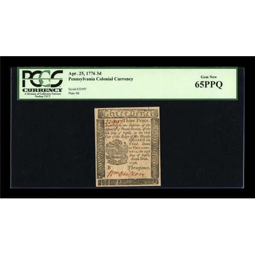 <B>Pennsylvania April 25, 1776 3d PCGS Gem New 65PPQ.</B></I> Consecutive to the last, as well as next...<BR><BR><b>Shipping:</b> Coins & Currency (<a target="_blank" href="http://www.heritageauctions.com/common/shipping.php">view shipping information</a>)