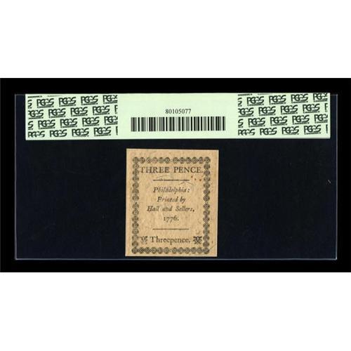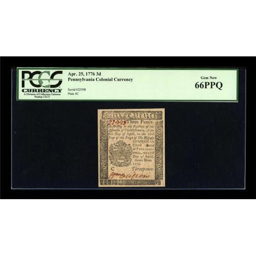 <B>Pennsylvania April 25, 1776 3d PCGS Gem New 66PPQ.</B></I> The last of the consecutive trio.<BR><BR><b>Shipping:</b> Coins & Currency (<a target="_blank" href="http://www.heritageauctions.com/common/shipping.php">view shipping information</a>)