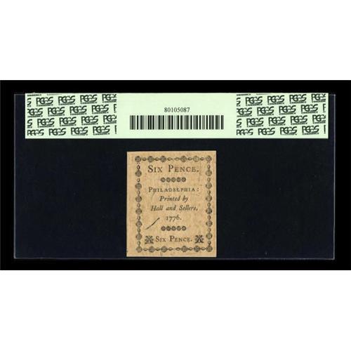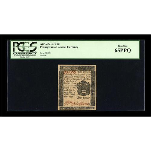 <B>Pennsylvania April 25, 1776 6d PCGS Gem New 65PPQ.</B></I> Only a pair of Six Pence notes are represented in 65PPQ, and are consecutive<BR><BR><b>Shipping:</b> Coins & Currency (<a target="_blank" href="http://www.heritageauctions.com/common/shipping.php">view shipping information</a>)