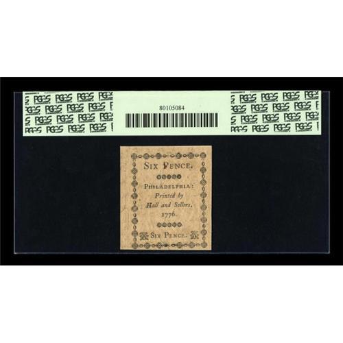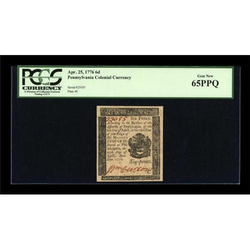 <B>Pennsylvania April 25, 1776 6d PCGS Gem New 65PPQ.</B></I> Consecutive to the last lot.<BR><BR><b>Shipping:</b> Coins & Currency (<a target="_blank" href="http://www.heritageauctions.com/common/shipping.php">view shipping information</a>)