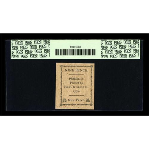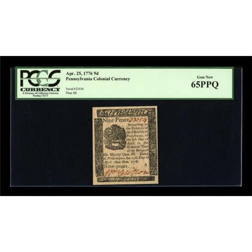 <B>Pennsylvania April 25, 1776 9d PCGS Gem New 65PPQ.</B></I> The last lot of the 24 notes from the sheet.<BR><BR><b>Shipping:</b> Coins & Currency (<a target="_blank" href="http://www.heritageauctions.com/common/shipping.php">view shipping information</a>)