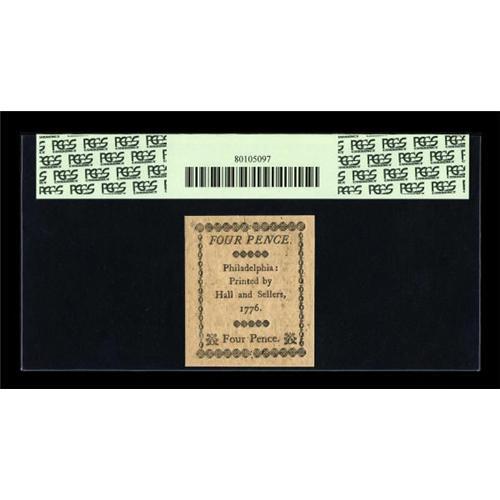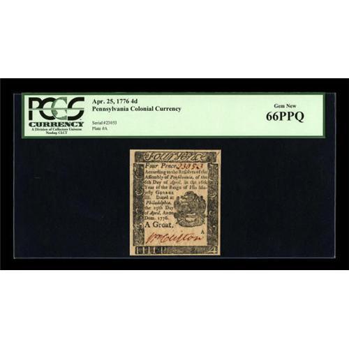 <B>Pennsylvania April 25, 1776 4d PCGS Gem New 66PPQ.</B></I> The first of two 66PPQ Four Pence notes.<BR><BR><b>Shipping:</b> Coins & Currency (<a target="_blank" href="http://www.heritageauctions.com/common/shipping.php">view shipping information</a>)