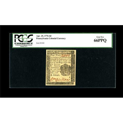 <B>Pennsylvania April 25, 1776 4d PCGS Gem New 66PPQ.</B></I> Stunning red ink signature and serial number rest upon this nicely margined example. We have had this denomination from this issue only once before in all of our auctions combined.<BR><BR><b>Shipping:</b> Coins & Currency (<a target="_blank" href="http://www.heritageauctions.com/common/shipping.php">view shipping information</a>)