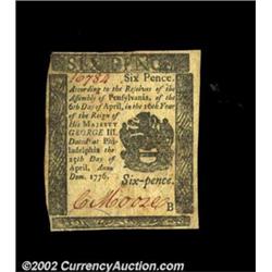 Pennsylvania April 25, 1776 6d Extremely Fine. This nice note has the visual appeal of a higher-grad
