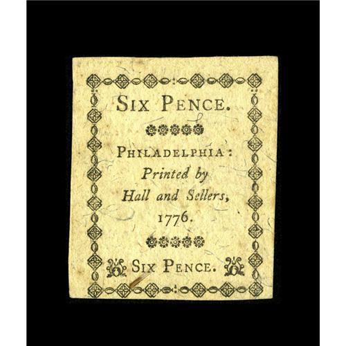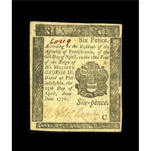 <B>Pennsylvania April 25, 1776 6d Gem New.</B></I> Not too many gems exist of this small change denomination, but this is certainly one of them. The margins are excellent with bold print quality and cardboard crisp paper.<BR><BR><b>Shipping:</b> Coin/Currency (<a target="_blank" href="http://www.heritageauctions.com/common/shipping.php">view shipping information</a>)