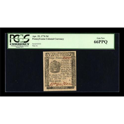 <B>Pennsylvania April 25, 1776 9d PCGS Gem New 66PPQ.</B></I> You now have four chances to acquire a Nine Pence note in 66PPQ. <BR><BR><b>Shipping:</b> Coins & Currency (<a target="_blank" href="http://www.heritageauctions.com/common/shipping.php">view shipping information</a>)