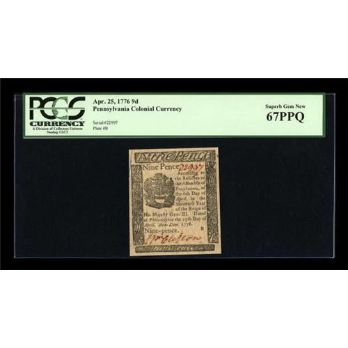 <B>Pennsylvania April 25, 1776 9d PCGS Superb Gem New 67PPQ.</B></I> The second, and last, Superb note from the sheet.<BR><BR><b>Shipping:</b> Coins & Currency (<a target="_blank" href="http://www.heritageauctions.com/common/shipping.php">view shipping information</a>)