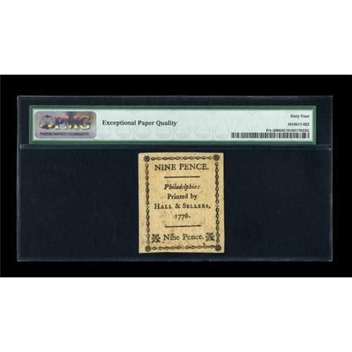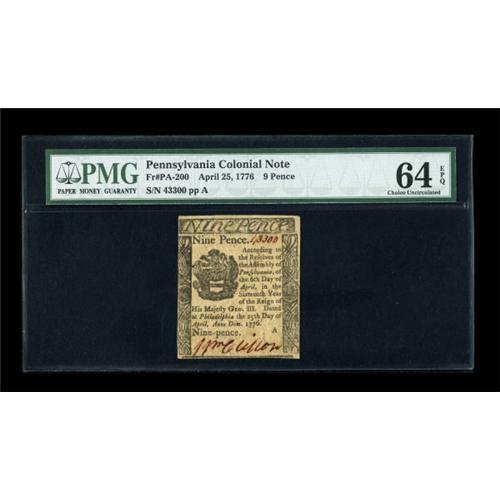<B>Pennsylvania April 25, 1776 9d PMG Choice Uncirculated 64 EPQ.</B></I> This small change note exhibits wonderful paper quality and strong ink with an encroaching left hand margin.<BR><BR><b>Shipping:</b> Coins & Currency (<a target="_blank" href="http://www.heritageauctions.com/common/shipping.php">view shipping information</a>)