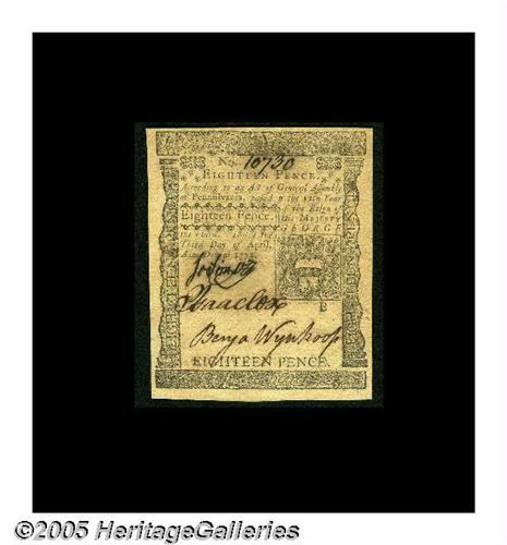 <B>Pennsylvania April 3, 1772 18d Choice New.</B></I> A broadly margined note, fully uncirculated and a Gem but for some very light discoloration.