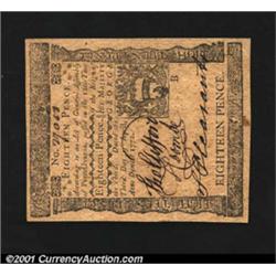Pennsylvania April 3, 1772 18d Very Choice New.<p>A light age spot at the bottom center is all that prevents the Gem grade on this beautifully centered, well printed note. Important notice: We expect to be auctioning lots at the rate of 200-250 per hour. Sometimes eBay Premier live bid software cannot keep up with that pace, so we strongly recommend that you place a realistic proxy bid now as insurance to avoid disappointment. Also please note that all Heritage/CAA lots purchased through eBay Premier carry a 20% Buyer's Premium.